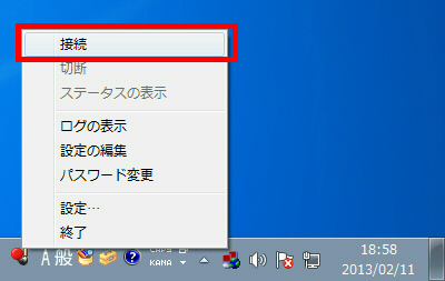 OpenVPN GUI のアイコンを右クリックし、「接続」をクリックしてください。